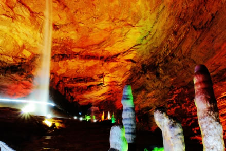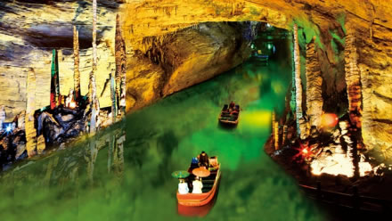 響水河是黃龍洞內三條地下陰河中的一條,位于第二層。它全長2800米,平均水深平6米,最深處有12米,目前乘船游覽其中的一段為800米,時間約8分鐘左右。響水河平均水溫常年在攝氏16度左右,盛產國家二級保護動物娃娃魚和通體透明的“玻璃魚”。蕩舟響水河,沿途充滿神秘誘惑的風景,如龍王金盔、海螺吹天等景點都值得您慢慢欣賞和品味?展扔腻洌段q犯。忽仰忽傾,若明若暗,恍若回到混沌的遠古時代。1992年聯(lián)合國世界自然遺產專家盧卡思考察響水河時,稱贊道:“黃龍洞是我見到的最漂亮的溶洞,還有這么美的陰河,真是不可思議!”