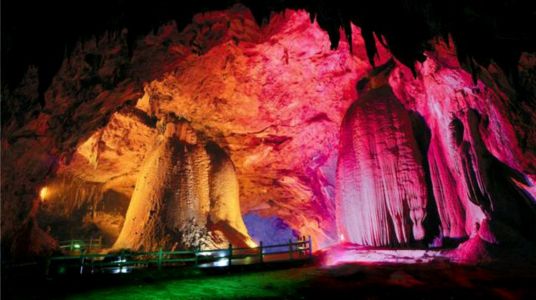 梅山龍宮位于湖南省婁底市新化縣資水河畔,是一個集溶洞、峽谷、峰林、絕壁、溪河、漏斗、暗河等多種喀斯特地質(zhì)地貌景觀于一體的大型溶洞群,有九層洞穴,探明長度2870余米,已開發(fā)游覽路線1896米,其中包括長466米世界罕見的神秘地下河。整個洞府分為龍宮迎賓、碧水蓮宮、玉皇天宮、龍宮仙苑、龍宮風情、龍鳳呈祥六大景區(qū)。