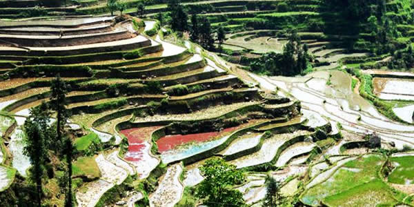 紫鵲界梯田位于新化縣西部山區(qū)水車鎮(zhèn)境內,她周邊的梯田達8萬余畝以上,其地勢之高,規(guī)模之大,形態(tài)之美,堪稱世界之最。紫鵲界生態(tài)環(huán)境優(yōu)美,梯田密集,形態(tài)原始,阡陌縱橫,線條流暢,山高水長,板屋交錯,充分展示出梯田的自然美、古樸美、形體美、文化美。尤其是隨著四季氣候的變化,使紫鵲界梯田更加婀娜多姿,如臨人間仙境。水奉公路盤旋于這些梯田之間達十余公里,梯田遍布于海拔500米至1000余米的十幾個山頭上,最大的不過1畝,最小的只能插幾十蔸禾,連綿起伏,輾轉盤旋,可謂是儀態(tài)萬方,令人贊嘆不已。據調查,紫鵲界梯田成型已有2000余年歷史,是苗、瑤、侗、漢等多民族
