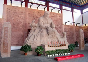 炎帝雕像一手拿谷穗,一手握耒耜,寓意開(kāi)拓農(nóng)耕文化。雕像高9.7米,座長(zhǎng)8.9米,寬4.7米,重約390噸,以紅色花崗石雕制。為福建光澤紅花崗巖雕琢。雕像兩旁立有一對(duì)聯(lián)石柱,“到此有懷崇始祖,問(wèn)誰(shuí)無(wú)愧是龍人”對(duì)聯(lián)為李鐸先生書寫。大殿左、右、后三面墻是大型廣東紅砂巖石雕壁畫,畫高5.2-7.9米,總長(zhǎng)53米,總面積321平方米,壁畫內(nèi)容為歌頌炎帝十大功德。