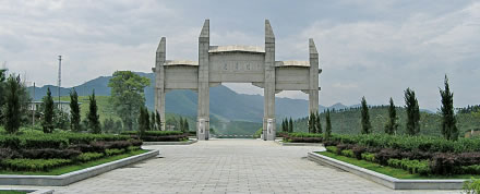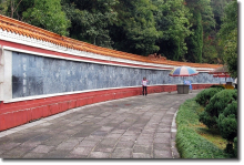 一進(jìn)為午門,拱形石門,高4.0米、寬2.6米,門前為長(zhǎng)寬均為50米的朝覲廣場(chǎng),左右分列為拱形戟門和長(zhǎng)方形掖門,門扇均為實(shí)榻大門。進(jìn)午門正中,樹(shù)立國(guó)家主席江澤民1993年9月4日親筆題寫的“炎帝陵”漢白玉石碑,前嵌盤龍龍陛,取名龍?bào)椿⒕幔煜乱唤y(tǒng),江山穩(wěn)固之意。左右分立雄健的山鷹和白鹿花崗石雕。