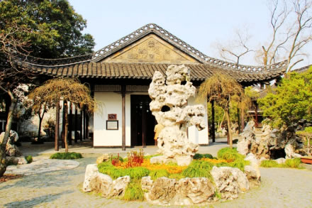 水池的北面是主人用于宴請(qǐng)賓客的宴廳,因廳角昂翹,像振翅欲飛的蝴蝶,故稱(chēng)蝴蝶廳。廳內(nèi)木壁上刻著歷代名碑字畫(huà)。