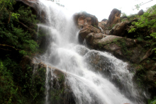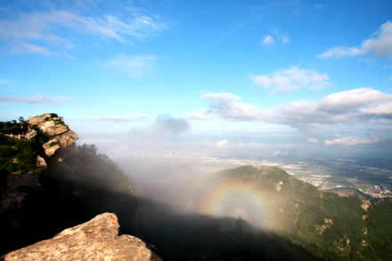 從遠(yuǎn)處山腰眺望一線天,這里就是著名的八戒石.很像一個戴著僧帽的老豬在綠樹叢中呼呼大睡。一線天下面是花果山山名摩崖石刻,游客都愛在這里留影,青山紅字,非常壯麗。這里還有天然碑、硯石等景觀。沿小路前進(jìn)可至墨香小徑,里面有百余位當(dāng)代書法名家的作品刻在天然石塊上;還可至怪石園,看千奇百怪與《西游記》有關(guān)的象形石。“神”字王在東部禿龍溝下,是刻在山體上的懷素草書“神”字,長39.4米、寬15.8米,為世界上最大的單體漢字,1996年被載入吉尼斯世界紀(jì)錄。 登上玉女峰是花果山之游的高潮,有緣的人在這里可看到云臺山兩個最為精彩的景致。一個是在迎曙亭看海上日出;另一個是看云臺鋪海,白云翻滾好像海水揚(yáng)波,露出來的峰頂就像大海里的蓬萊仙島,群山俯伏,阡陌縱橫,此情此景令人有飄飄欲仙的感覺。