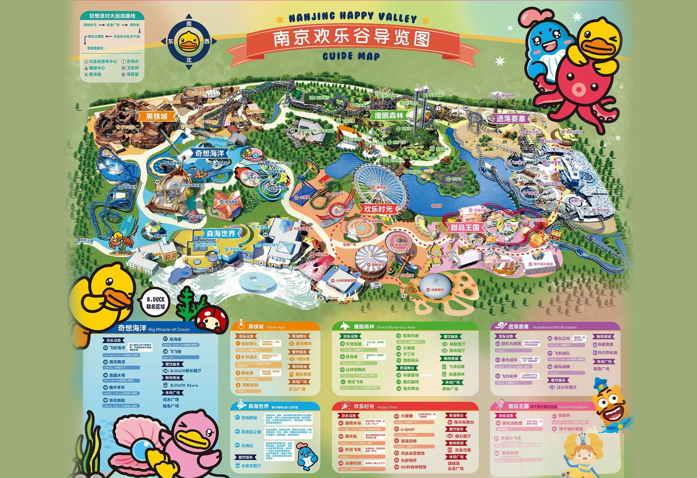 南京歡樂谷擁有歡樂時(shí)光、遺落要塞、甜品王國、黑鐵城、奇想海洋、魔眼森林六大園區(qū),與香港知名品牌B.Duck小黃鴨、動畫IP餅干警長進(jìn)行了創(chuàng)意聯(lián)動。此外,南京歡樂谷首次在樂園中融入硬核蒸汽朋克風(fēng),推出集復(fù)古情懷、機(jī)械美學(xué)、哥特建筑等特色于一體的區(qū)域“黑鐵城”,為城市青年的假日休閑注入了更多的潮玩基因。