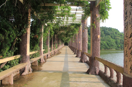 紫藤文化長廊位于三仙湖東北岸,建于2007年10月。長133米,寬3.8米,高4米,長廊中有76根柱子,柱子上有從古至今的76位名人題寫的詩詞。紫藤文化長廊6個大字,由原中央電視臺副總編輯、中央電視臺書畫院院長趙立凡寫。