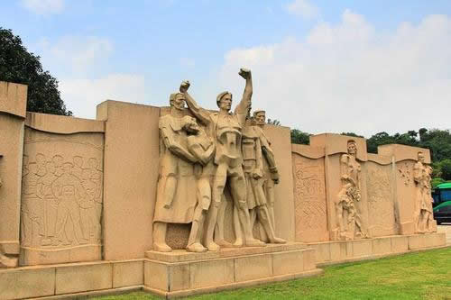 雨花臺陵園大門由花崗石砌成,高11.7 米。大門內三面環(huán)山的廣場上聳立著一座烈士群雕,雕像高10.3米、寬14.2米,由179塊花崗石拼裝而成,是我國目前最大的花崗石群雕。雕像采用了上實下虛的手法,著重刻劃了烈士的面部神態(tài)。