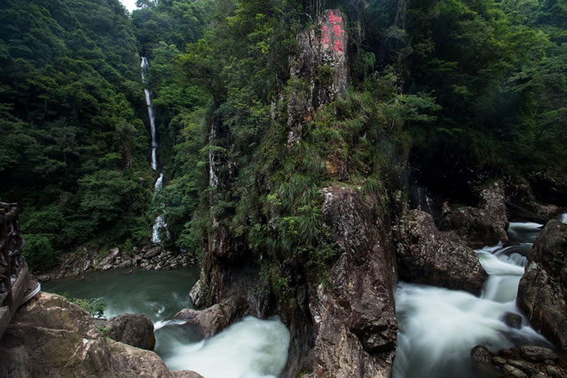 東江第一瀑由福鰲塘和山上大小溪流匯集而成,瀑布單級落差120多米,是目前景區(qū)發(fā)現(xiàn)單級落差最大的常流瀑布,氣勢雄偉,兩側(cè)峭壁凌空,古木參天。飛瀑前方視野開闊,遠處青山疊翠,林海蒼茫,令人心曠神怡。石壁上東江源三個字是由全國政協(xié)原副主席葉選平題寫。