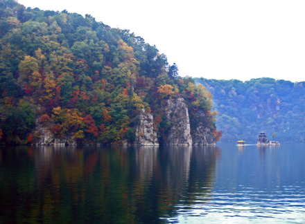 映霞壁是碼頭邊的陡峭石壁,高90余米,面向正東,每天朝陽初升的時(shí)候,萬丈霞光與水氣發(fā)生了光學(xué)折射,遠(yuǎn)遠(yuǎn)望過來,佛光普照,宛如迷離仙境一般。