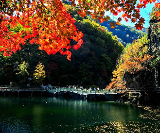 “雄獅守關(guān)”山巖壁立,頗像雄獅,怒目圓睜,守衛(wèi)關(guān)隘!熬Ш熎俨肌毙稳缪├、三折跌蕩、斷落處濺起朵朵水花、瀉入青潭、轟鳴振耳。特別是昆明世博會首次參展的本溪市市花天女木蘭,秋天萬山紅遍,層林盡染的楓葉,已成為關(guān)門山國家森林公園內(nèi)最為獨特的景觀。