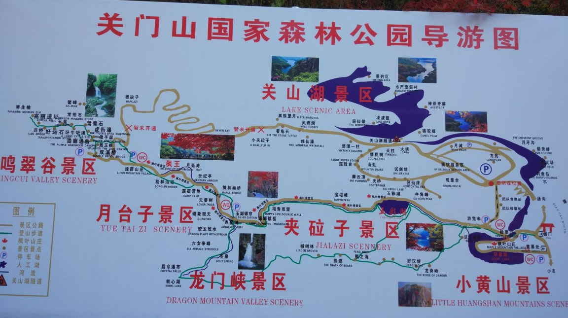 森林公園內(nèi)有四大景區(qū)小黃山景區(qū)、夾砬子景區(qū)、龍門峽景區(qū)和月臺子景區(qū),共計108處景點。它有三道門:北門,在小市方向,雙峰對峙,中間拱橋相連;南門,在去湯溝的嶺頂,公路從中穿過,十分險要;中門,在深谷河道中,“雙扉”夾水,寬只二十余米,為興修水庫的天然門柱,有人把關(guān)門山風景譽為“小江南”,“賽黃山”,說它有五美:山美,陡峭,俊秀,似一簇簇盆景;樹美,樹木種類繁多,特別是秋天的楓葉,冬季植根于峭壁上的蒼松,非常壯觀;水美,湯河穿過山谷,匯集小溪,飛瀑,“奪門”而出,似來自于天際;花美,天女木蘭,山杜鵑,漫山遍野;云美麗,清晨雨后,山谷中云霧繚繞,如披輕紗,分外嫵媚。歷代文人多有詩篇贊頌,許多美術(shù)工作者,經(jīng)常到這里寫生、作畫。