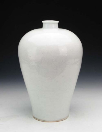 明永樂白釉暗串枝蓮花梅瓶:小口,圓唇,短頸,豐肩。器物紋飾為劃花,器物肩部上下各兩道弦紋,中間為靈芝纏枝花紋,八顆靈芝首尾相接,纏枝不斷。腹部兩組大荷葉蓮花,每組為三朵蓮花并蒂爭相開放,神態(tài)各異。此瓶為明永樂時期景德鎮(zhèn)官窯器,甜白釉,白中閃青。釉色白瑩,光亮潤澤,胎質(zhì)細(xì)潔,整個器物造型規(guī)矩。肩部圓潤略顯豐滿。底足為平底。
