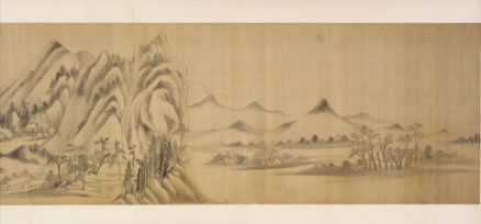 董其昌仿米黃山水圖卷:明晚期,絹本。用筆參以披麻與米點皴法,為其自家面貌。卷后部行書自題:“家有黃子久《富春大嶺圖》、米元暉《瀟湘圖》,和會兩家筆意為此卷,大都子久畫出于巨然與海岳父子同參也!焙笫鹂睿骸岸鬃R”,下鈐“知制誥日講官”、“董其昌印”白文印二方?顐(cè)鈐“楨父審定”、“墨緣堂來氏收藏書畫記”二印。