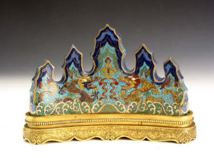 乾隆款掐絲琺瑯海水雙龍筆架:筆架整體呈弧形山巒狀,五組山峰聳立,峰與峰之間壑谷可做承筆之用。山體采用掐絲琺瑯工藝制成,以深藍、淺藍、綠色、純藍等色為地,使山峰更具層次感;峰下飾有金黃色行龍,龍首之間為金黃色萬字紋,龍身下方飾有綠色海水紋。筆架之下為弧形鎏金底座,鏨刻一圈珍珠紋,其下為束腰式,再下面鏨刻卷草紋,座底為如意云紋足,底部中央鏨刻陰文楷書“乾隆年制”4字款。