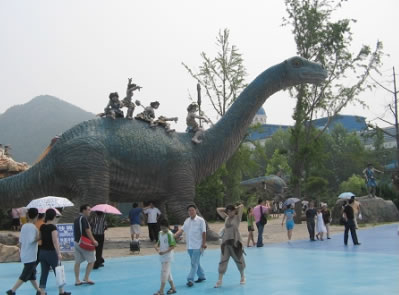 侏羅紀(jì)激流探險,總占地面積8600平方米,以一種時空穿插的景觀設(shè)計手法,將五種八只侏羅紀(jì)時期的恐龍置身于虛幻的遠(yuǎn)古村落中。載客古船,沿210米長,15米高的水道激流急下,沿途中,一只高9米,長19.8米,重約8噸的亞洲最大的機械恐龍“巨無霸”,不時的向沖刺在激流中的游人搖頭擺尾,吼叫或噴水,載客古船激起的25米高的巨浪。 旅游船
