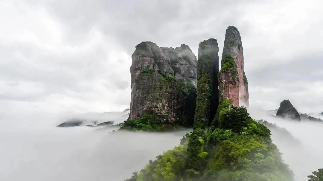 • 特色:江郎山的標志性景觀,由三塊巨石組成,形似石筍天柱,被譽為“神州丹霞第一峰”。