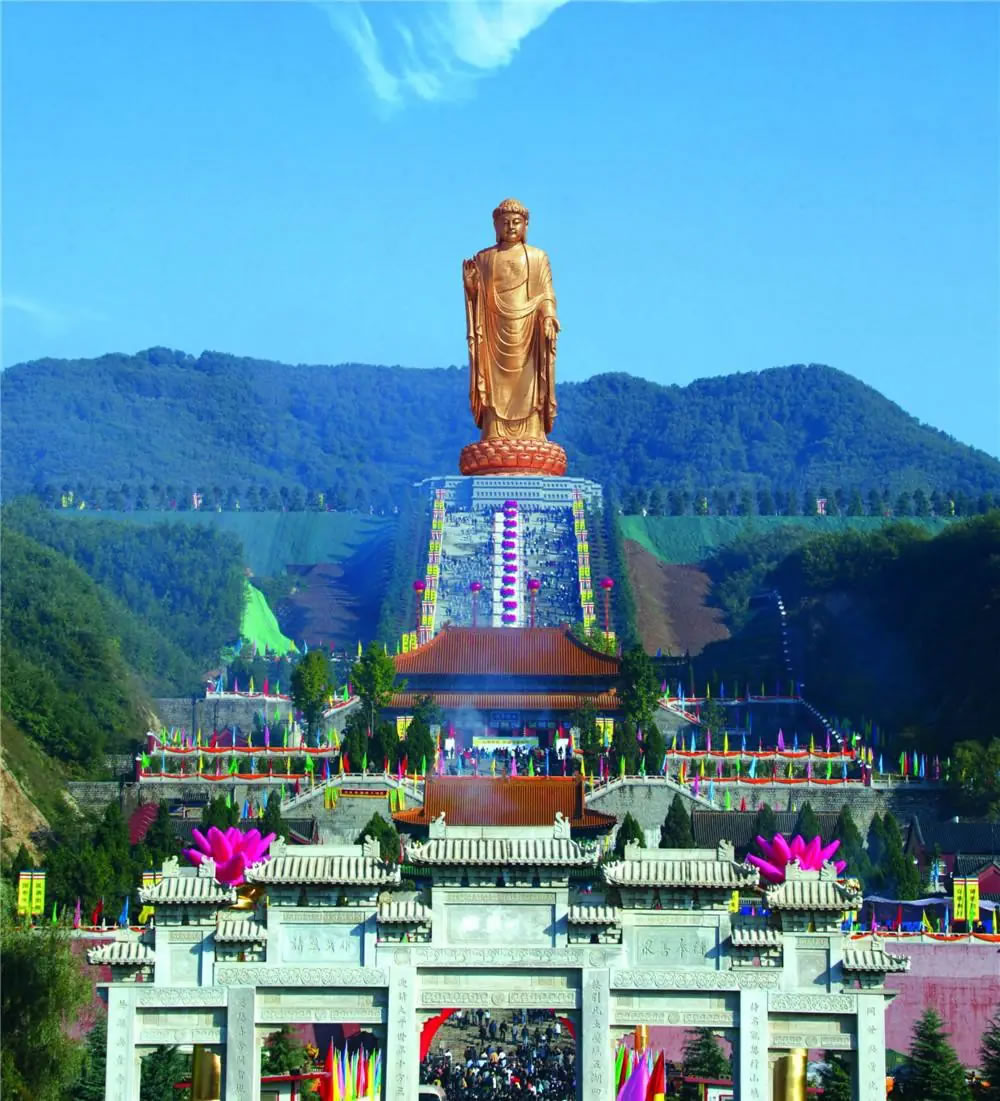 中原大佛景區(qū)位于河南省平頂山市魯山縣境內(nèi),地處伏牛山生態(tài)旅游黃金位置,景區(qū)規(guī)劃面積13.40平方千米。中原大佛景區(qū)由牌坊、佛泉寺、愿心臺、;鄞蟮馈⒍Y佛臺、中原大佛、吉祥鐘、佛教文化宮殿、文化碑廊等景點景觀組成。大佛總高208米,身高108米,蓮花座高20米,金剛座高25米,須彌座高55米,中原大佛整體佛像鑄造用銅3300噸,黃金108公斤,特殊鋼15000余噸,表面面積為11300平方米,通過焊接13300塊銅板而成。景區(qū)內(nèi)的天瑞吉祥金鐘凈重116噸,是載入《吉尼斯世界紀錄大全》的“世界最大外擊青銅鑄鐘”,世界佛光總會會長、臺灣佛光山開山宗長星云大師為大佛題寫“世界第一中原大佛”大字,大佛前還有有四季長流的沙河圣水,佛泉湯、佛泉寺、中原釋迦大佛、天瑞吉祥鐘等景觀。