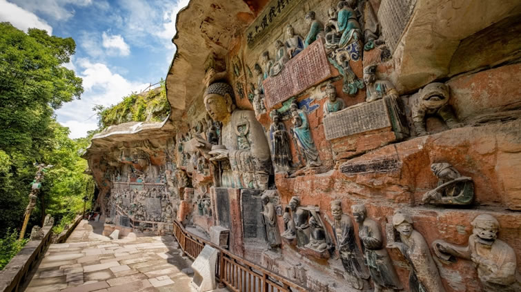 大足石刻景區(qū)位于重慶市大足區(qū),是世界文化遺產(chǎn)、國(guó)家5A級(jí)旅游景區(qū),也是世界八大石窟之一。景區(qū)始建于初唐,鼎盛于兩宋,代表了公元9至13世紀(jì)世界石窟藝術(shù)的最高水平,以寶頂山、北山、南山、石門山、石篆山“五山”為代表,共有造像5萬余尊,銘文10萬余字。大足石刻是石窟藝術(shù)史上的晚期杰作,將佛教、道教、儒家思想融合,展現(xiàn)了宋代以來的社會(huì)生活、信仰與藝術(shù)成就,被譽(yù)為“東方藝術(shù)明珠”。
