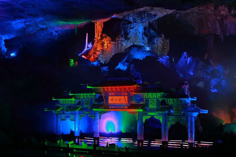 - 特色:洞內(nèi)分為七個洞廳,前四廳為自然景觀,展示石筍、石幔、石花等形態(tài)各異的鐘乳石;后三廳為人工打造的“神仙世界”游樂宮,結(jié)合聲、光、電技術(shù),展現(xiàn)奇幻的溶洞世界。