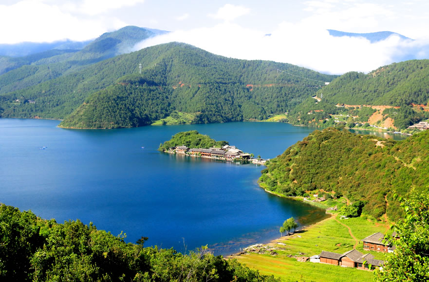 - 特色:三面環(huán)湖,晨霧中形成“愛心湖”景觀,被譽為“瀘沽湖明信片”。