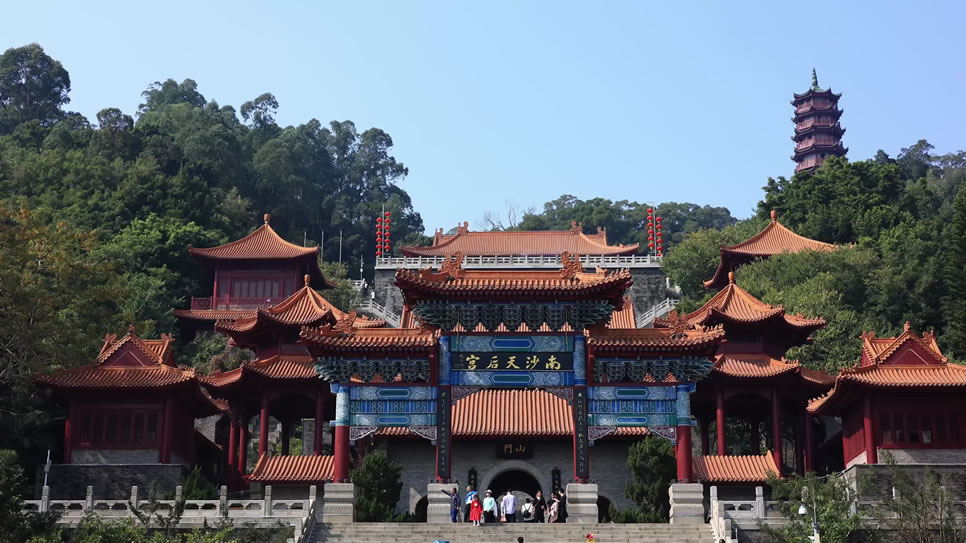 廣州南沙天后宮,又叫“媽祖廟”,位于廣東省廣州市南沙區(qū)天后路88號,坐落于大角山東南麓,地處粵港澳大灣區(qū)之心,瀕臨珠江出?诘牧尕暄,占地面積達(dá)18萬平方米。廣州南沙天后宮前身是明代建于鹿頸村的天妃古廟,清乾隆年間經(jīng)重修定名為元君古廟,抗戰(zhàn)時期被日寇飛機(jī)炸毀,而后于1994年重建。廣州南沙天后宮是為紀(jì)念海上女神林默而建,是一個以媽祖文化為主題的景區(qū),是粵港澳大灣區(qū)媽祖文化交流中心,亦是東南亞最大之媽祖廟。廣州南沙天后宮采用清式建筑對稱布局,高低錯落地依山而建,建筑的特點集北京故宮的風(fēng)格和南京中山陵的氣勢于一體,規(guī)模為現(xiàn)今世界同類建筑之最。廣州南沙天后宮由廣場、宮殿和南嶺塔三部分構(gòu)成,“天后八景”包括:濱海銀灘朝陽、五彩靈徑、媽祖靈釵、“南沙人”遺址、靈宮賜福、南嶺夕照、抗戰(zhàn)神炮、默娘之家八個景點。