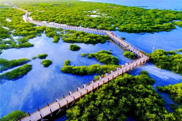 1. 紅樹林生態(tài)區(qū):綿延6公里的生態(tài)海岸線,漲潮時呈現(xiàn)“海上森林”奇觀,退潮時灘涂可見招潮蟹、彈涂魚等生物,適合觀鳥、攝影。