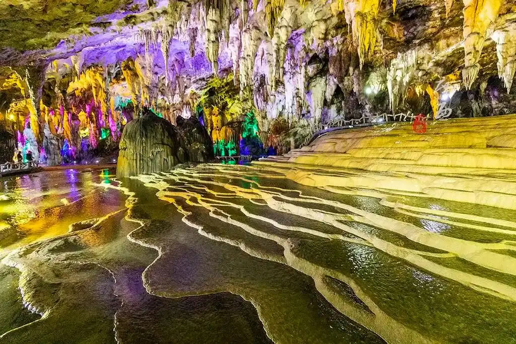- 核心特色:洞內(nèi)分四層結(jié)構(gòu),已開(kāi)放第二層約2公里游覽線(xiàn),包含五大主題廳——吉星迎賓、壯鄉(xiāng)聽(tīng)海、云山鑒水、詩(shī)畫(huà)田園、幽靜奇觀。景觀涵蓋鈣華池梯田、神象賜福、天下第一鐘等1000余處天然獨(dú)立景觀,其中鈣華池群面積達(dá)6000平方米,黑白對(duì)比形成獨(dú)特視覺(jué)奇觀。