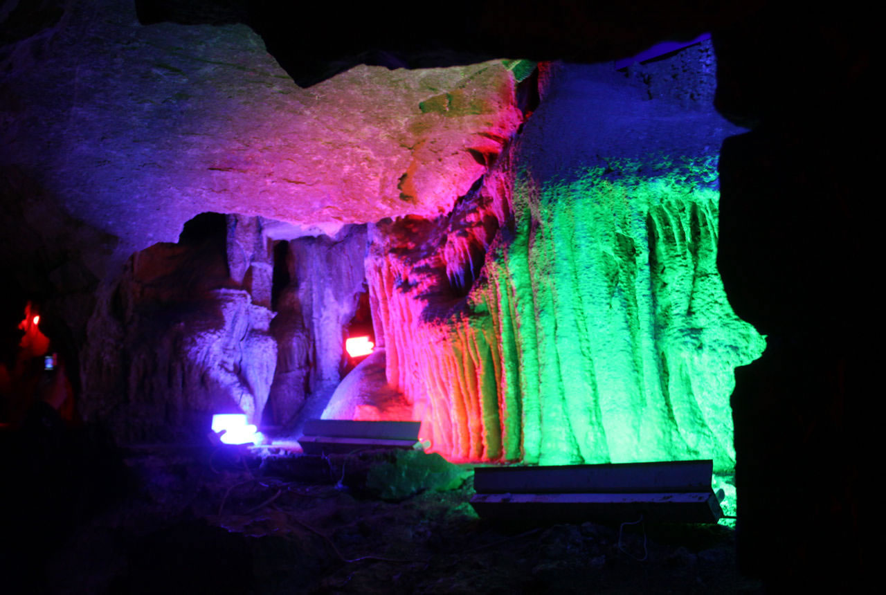 4. 石鐘乳群:洞頂垂掛的鐘乳石與地面石筍形成“天地對望”景觀,燈光映射下如夢似幻。