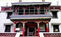 喇彌仁殿(菩提道學(xué)經(jīng)堂),又稱日木倫殿。建于光緒十八年(1892年),位于護(hù)法殿后邊西北高聳的山坡上,為教義戒律學(xué)部,這個學(xué)部在內(nèi)蒙地區(qū)藏傳佛教寺院中只有五當(dāng)召設(shè)立。是召廟建筑群中建造年代最晚的建筑物。殿內(nèi)正中供奉銅鑄高九米的黃教創(chuàng)始人宗喀巴坐像。左右兩側(cè)塑其兩大弟子嘉曹杰和克珠杰塑像。兩側(cè)木龕內(nèi)有一千尊一模而成的宗喀巴塑像。二樓凸起的天窗既可容納高大的塑像,又可采納光線,顯示了獨具匠心的藏傳佛教寺廟建筑特點。