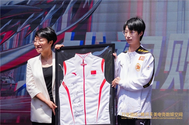 開業(yè)現(xiàn)場(chǎng)還舉辦了隆重的授牌儀式。由杭州第19屆亞運(yùn)會(huì)電子競(jìng)技王者榮耀亞運(yùn)版本冠軍選手林恒,上臺(tái)將由6位亞運(yùn)冠軍簽名的戰(zhàn)袍贈(zèng)予了萬(wàn)斐酒店騰訊天美電競(jìng)數(shù)娛空間項(xiàng)目。