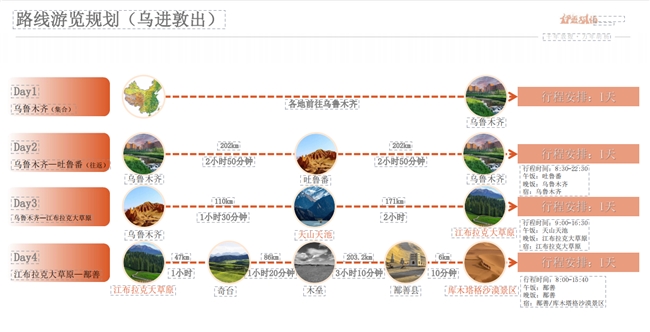 線路三“千里西域行”則以“千年敦煌·萬(wàn)年胡楊”——烏魯木齊至敦煌絲路星辰探索之旅為主題,該線路亮點(diǎn)為敦煌莫高窟、鳴沙山、伊吾胡楊、北疆自然風(fēng)景觀光和民族文化體驗(yàn)等。全程路線大約2202.6公里