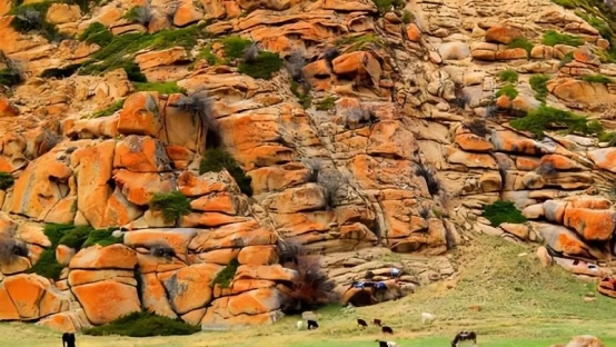 6.伊吾紅石峪(伊吾前山鄉(xiāng)北部山地中,背風(fēng)坡的山地草原,有一片罕見(jiàn)的花崗巖山體,被凜冽的北風(fēng)風(fēng)化成丘陵?duì)睿薮蟮幕◢弾r則破碎成一個(gè)個(gè)的小塊,花崗巖破碎成類似于黃山飛來(lái)石的感覺(jué)!)