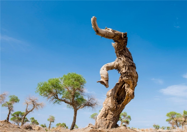 九千年胡楊,這里胡楊樹形也同樣奇特,有的胡楊猶如一頭大象,象鼻朝下吸水,象背馱著元寶自遠(yuǎn)處而來(lái),為游客帶來(lái)吉祥和財(cái)富;有的胡楊春萌新芽,夏葉婆娑,秋金滿地,冬蘊(yùn)傲骨;有的胡楊就像古代的帝王莊嚴(yán)的祭祀著天地的生靈,祈求一方祥和,護(hù)佑一方安寧。
