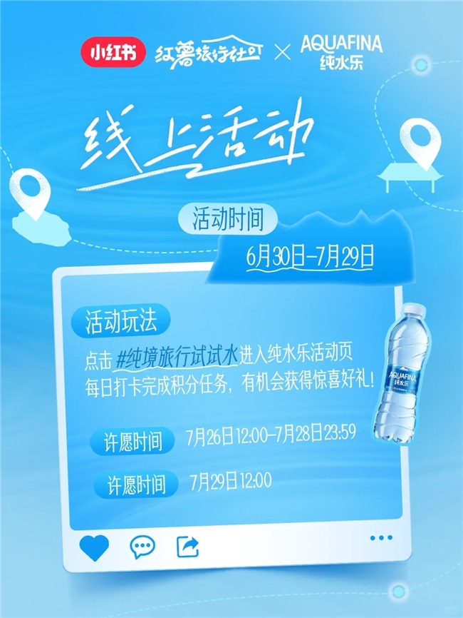 貼合旅行魅力,一場(chǎng)線上線下聯(lián)動(dòng)的全新旅行玩法就此展開。@AQUAFINA純水樂(lè) 官方賬號(hào)在小紅書發(fā)布游玩號(hào)召視頻官宣活動(dòng),分享這場(chǎng)“水是純凈的,心是自由的”旅行概念。小紅書@好好玩情報(bào)局 承接活動(dòng)外放,介紹線上線下活動(dòng)玩法,正式開啟為期一個(gè)月的攢積分任務(wù)限時(shí)許愿贏好禮活動(dòng),以趣味性互動(dòng)玩法、豐厚的獎(jiǎng)勵(lì)機(jī)制吸引用戶主動(dòng)關(guān)鍵詞搜索、品牌筆記瀏覽、品牌主頁(yè)關(guān)注、分享品牌信息,助力純水樂(lè)品牌成功將流量變?yōu)榱?ldquo;留量”。