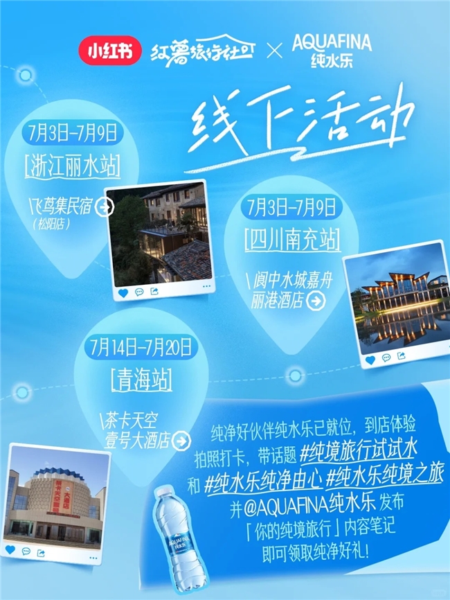 在三位“先鋒試水官”的帶動(dòng)下,四川南充、浙江麗水、青海三大純境路線被更多用戶關(guān)注。純水樂(lè)也協(xié)同小紅書在三大純境路線合作的民宿酒店設(shè)置線上線下聯(lián)動(dòng)新玩法。7月3日-7月9日,浙江麗水站飛蔦集民宿(松陽(yáng)店)、四川南充站閬中水城嘉舟麗港酒店線下互動(dòng)贏好禮活動(dòng)率先啟動(dòng),位于青海的茶卡天空壹號(hào)大酒店7月14日-7月20日也很快解鎖加入該活動(dòng)。