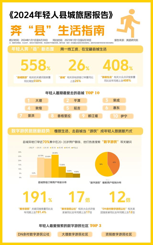 美團(tuán)近期發(fā)布的《2024年輕人縣城旅居報(bào)告》(下稱(chēng)《報(bào)告》)顯示,今年暑期,大理、平潭、榮成、敦煌、延吉為年輕人最?lèi)?ài)去的縣城。這些年輕人熱衷搜索“數(shù)字游民”“旅居”等關(guān)鍵詞,“數(shù)字游民公社”大眾點(diǎn)評(píng)搜索量同比去年同期上漲17倍。