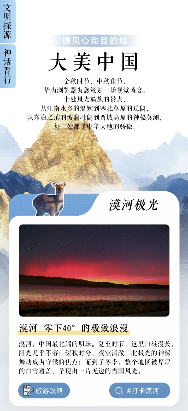 “大美中國(guó)”可以說給熱愛自然風(fēng)光的愛好者帶來了視覺盛宴。里面精選了十處極具代表性的中華美景,從溫婉細(xì)膩的江南水鄉(xiāng)到遼闊壯麗的塞北草原,從波瀾壯闊的東海之濱到神秘莫測(cè)的西域高原,每一處都是對(duì)中華大地絕美風(fēng)光的極致詮釋。其中,以漠河“零下40°的極致浪漫”為例,無(wú)論是夏日的長(zhǎng)晝、深秋的北極光,還是冬日的雪國(guó)風(fēng)光,都讓人心生向往。用戶不僅可以在專題頁(yè)中詳細(xì)了解每一處景點(diǎn)的獨(dú)特魅力,還能一鍵直達(dá)詳細(xì)旅游攻略,包括大興安嶺自駕環(huán)線等周邊推薦,輕松規(guī)劃出完美的國(guó)慶出游計(jì)劃。