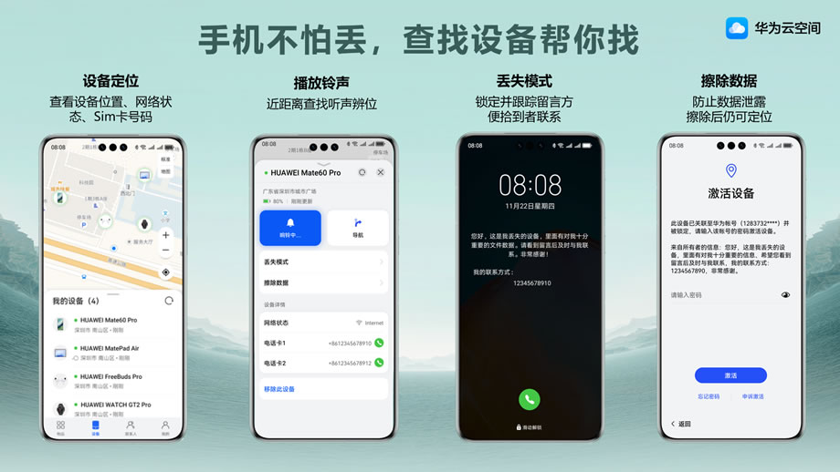 如果設備意外遺失且無法找回,華為云空間的“數據擦除”功能也能為你的隱私安全再“上保險”,在其他設備上登錄同一個華為賬號,遠程操作即可將丟失設備恢復出廠設置,永久刪除設備存儲的數據,有效保護個人數據不被泄露。