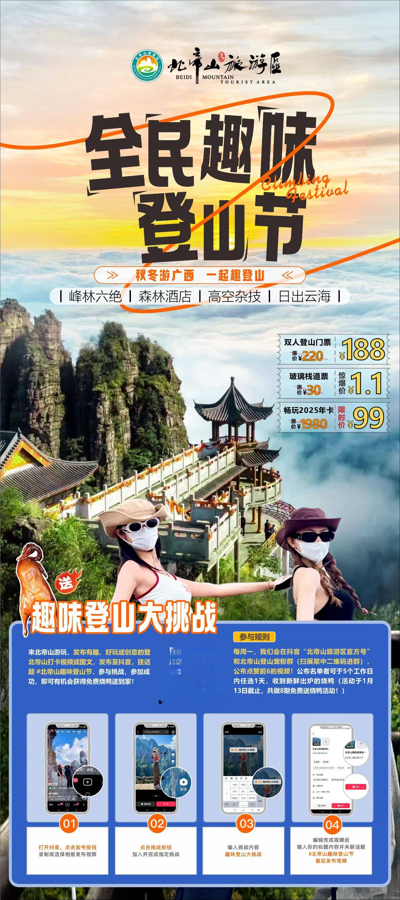 北帝山喊你來打卡!把你的鏡頭對準(zhǔn)北帝山,無論是打卡的、炫酷的、或搞笑的,只你大膽曬出來!發(fā)布至抖音,參加趣味登山大挑戰(zhàn)掛話題#北帝山趣味登山節(jié),即可參加成功贏免費(fèi)燒鴨送到家!