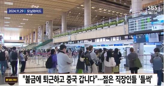 韓國機(jī)場排起長隊(duì)(韓國SBS電視臺報(bào)道截圖)