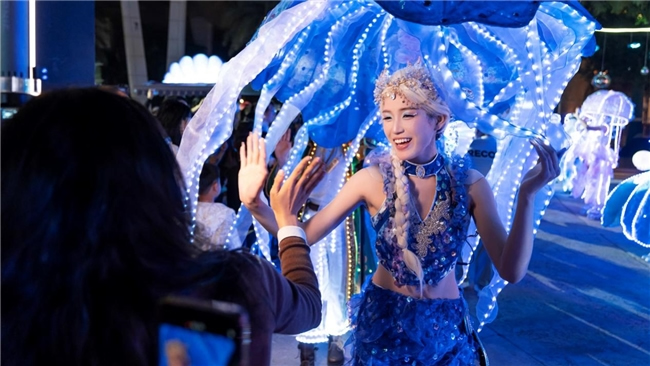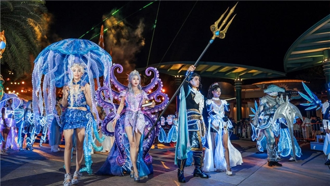 在本次活動中,特別設(shè)置的NPC(非玩家角色)演藝巡游活動成為一大亮點。亞特蘭蒂斯原創(chuàng)NPC“海洋七子”驚艷出場,包括擁有無限力量、守護光明正義的阿特拉斯王子,用優(yōu)雅的歌聲喚醒深海綺夢的人魚星娜,預言洞悉萬物、感知生命力量的章魚菲婭,智慧引領(lǐng)科技、把握未來方向的海龜拉斐爾,勇敢成為利刃、開啟榮耀之路的鯊魚坦克,在美麗的星光下閃耀夢幻光芒的水母歐若拉,以及愛能穿梭角落、點亮浩瀚海洋的海馬維納斯。演員們身著奇幻服飾,化身這些海洋生物形象,在園區(qū)內(nèi)巡游展演,與游客近距離互動,創(chuàng)造了難忘的度假記憶。