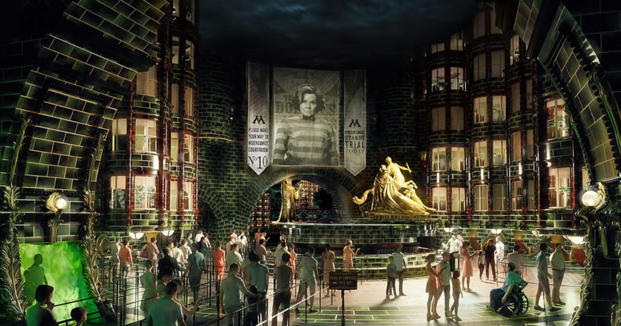 第二個(gè)矚目的新園區(qū)是哈利波特魔法世界(The Wizarding World of Harry Potter)的擴(kuò)建園區(qū):并命名為魔法部之謎(Ministry of Magic),項(xiàng)目首次跳出了一期園區(qū)霍格沃茨與對(duì)角巷,深入《神奇動(dòng)物》系列中1920年代的巴黎魔法部。喬治卡爾森(George Carlson)設(shè)計(jì),英國(guó)全息視覺公司Holovis打造的 “魔法部時(shí)空電梯(Ministry Time-Turner Elevator)”將無縫穿梭紐約、倫敦與巴黎,采用4D投影實(shí)時(shí)渲染窗外街景,形成極具震撼力的沉浸式魔法場(chǎng)景體驗(yàn)。而 “默默然防御訓(xùn)練(Obscurial Escape)” 多人射擊游戲,需用魔杖擊退熱感應(yīng)投影的黑暗生物,積分實(shí)時(shí)影響勛章等級(jí),將游客互動(dòng)參與性帶入全新的高度。