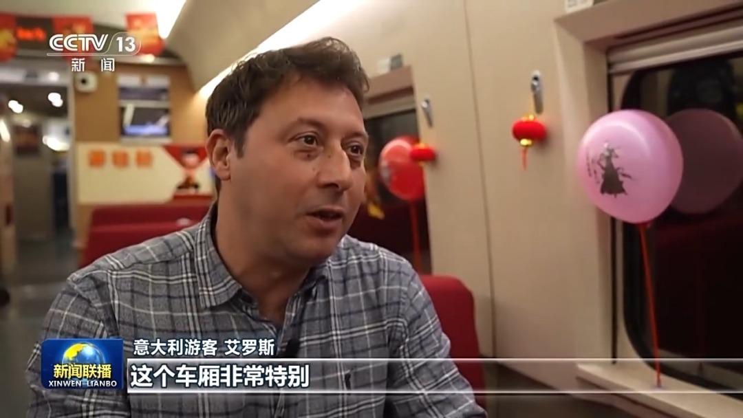 意大利游客 艾羅斯:這個(gè)車廂非常特別,我們知道這段時(shí)間哪吒的話題非常流行,大家都很喜歡這部電影。在體驗(yàn)中國高鐵速度的同時(shí),這也是一種很好的旅行方式,這非常好。