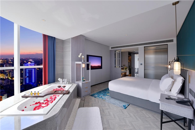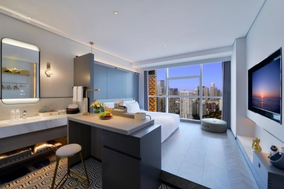 客房哲學(xué):320間客房搭配全景落地窗設(shè)計(jì),干濕分離設(shè)計(jì)搭配臨窗浴缸,申寶冷暖床墊實(shí)現(xiàn)“冬暖夏涼”智能溫控,高端雅蘭布草,細(xì)節(jié)處彰顯東方待客之道。