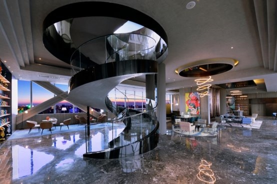 高空視野:31樓全透明云端餐廳可俯瞰人民南路車水馬龍,180°落地窗將城市天際線化為流動(dòng)畫(huà)卷;旋轉(zhuǎn)樓梯以光影裝置串聯(lián)空間敘事,每一步皆成風(fēng)景。