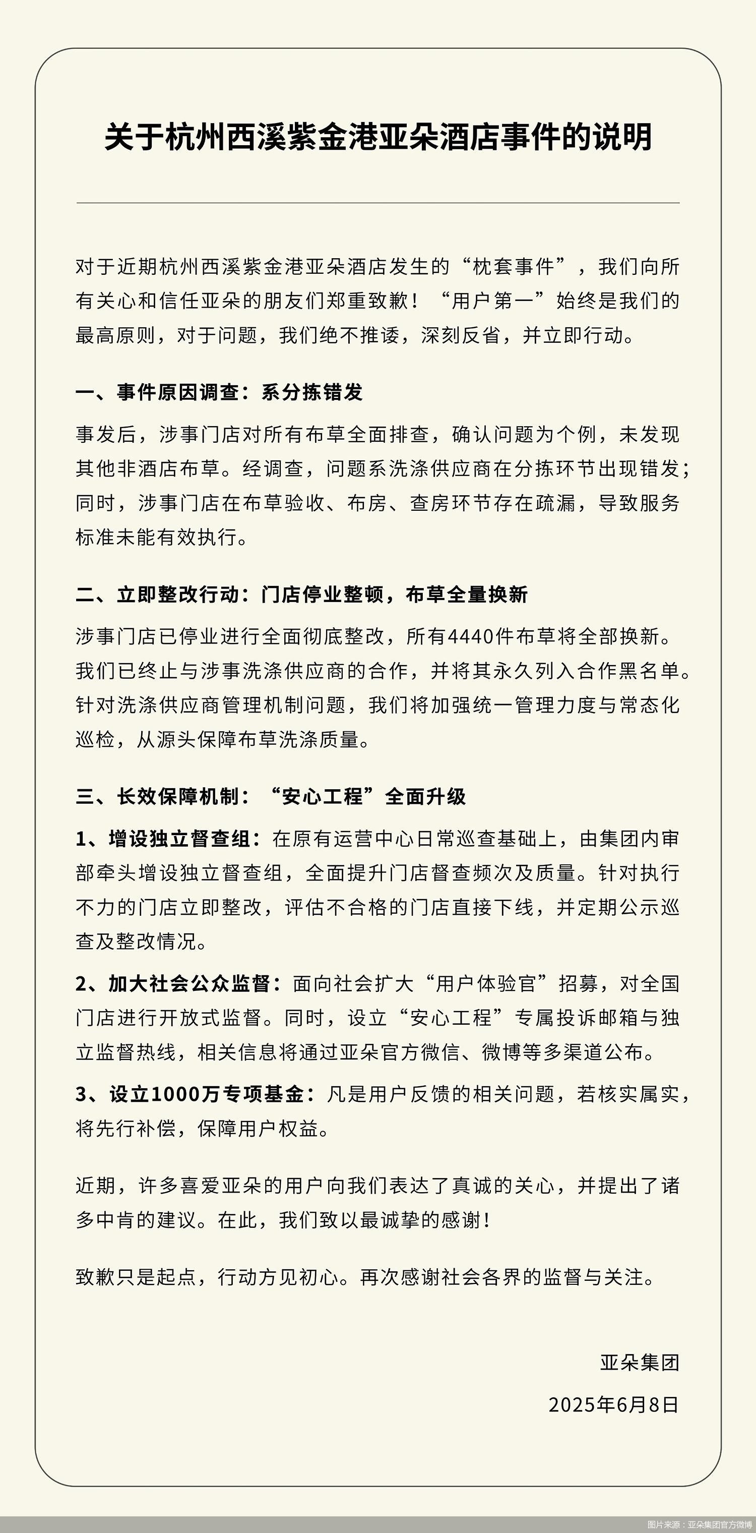 6月8日,據(jù)“亞朵集團(tuán)”官方微博消息,亞朵集團(tuán)發(fā)布關(guān)于杭州西溪紫金港亞朵酒店事件的說(shuō)明,對(duì)于近期杭州西溪紫金港亞朵酒店發(fā)生的“枕套事件”,亞朵集團(tuán)向所有關(guān)心和信任亞朵的朋友們鄭重致歉。事發(fā)后,涉事門店對(duì)所有布草全面排查,確認(rèn)問(wèn)題為個(gè)例,未發(fā)現(xiàn)其他非酒店布草。經(jīng)調(diào)查,問(wèn)題系洗滌供應(yīng)商在分揀環(huán)節(jié)出現(xiàn)錯(cuò)發(fā);同時(shí),涉事門店在布草驗(yàn)收、布房、查房環(huán)節(jié)存在疏漏,導(dǎo)致服務(wù)標(biāo)準(zhǔn)未能有效執(zhí)行。