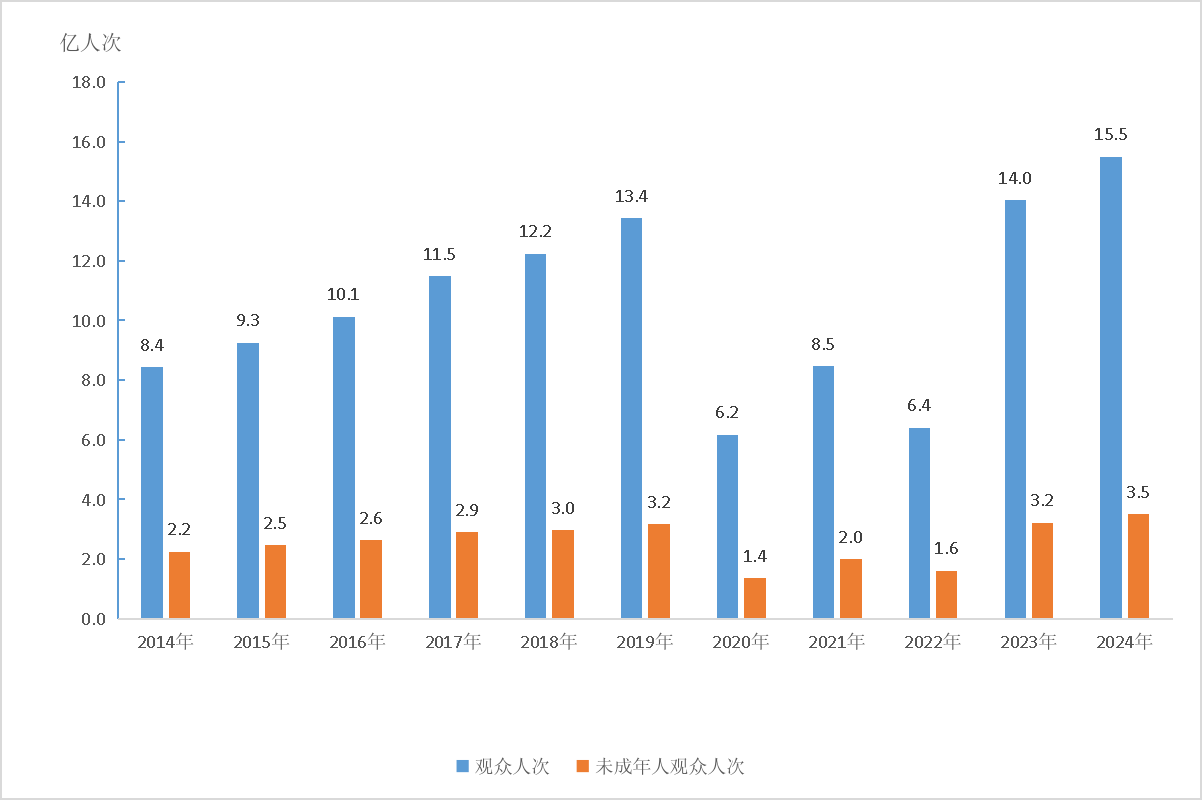圖4:2014—2024年全國(guó)文物機(jī)構(gòu)接待觀眾人次及未成年人觀眾人次
