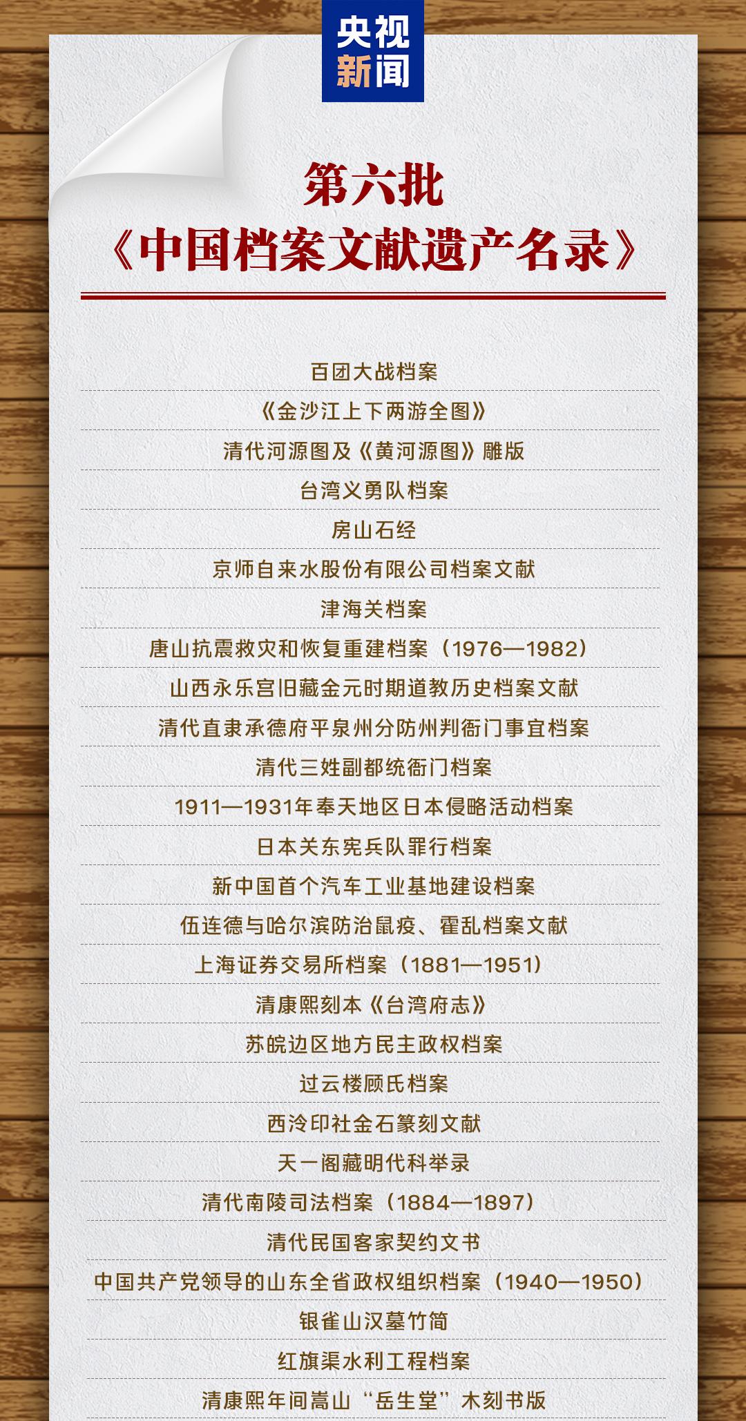 6月9日是國際檔案日。檔案,見證著歷史,傳承著文化。國家檔案局公布第六批《中國檔案文獻遺產(chǎn)名錄》,其中包括《百團大戰(zhàn)檔案》《“重慶大轟炸”檔案》《紅旗渠水利工程檔案》《何尊等五組周代有銘青銅器》《銀雀山漢墓竹簡》《廣交會創(chuàng)辦初期檔案(1956—1959)》《民族團結誓詞碑檔案》等52個項目。