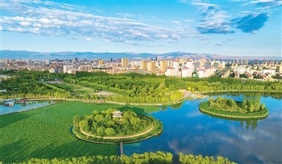 雨后初晴的甘肅省張掖國家濕地公園碧水藍(lán)天,綠意盎然,景美如畫。
