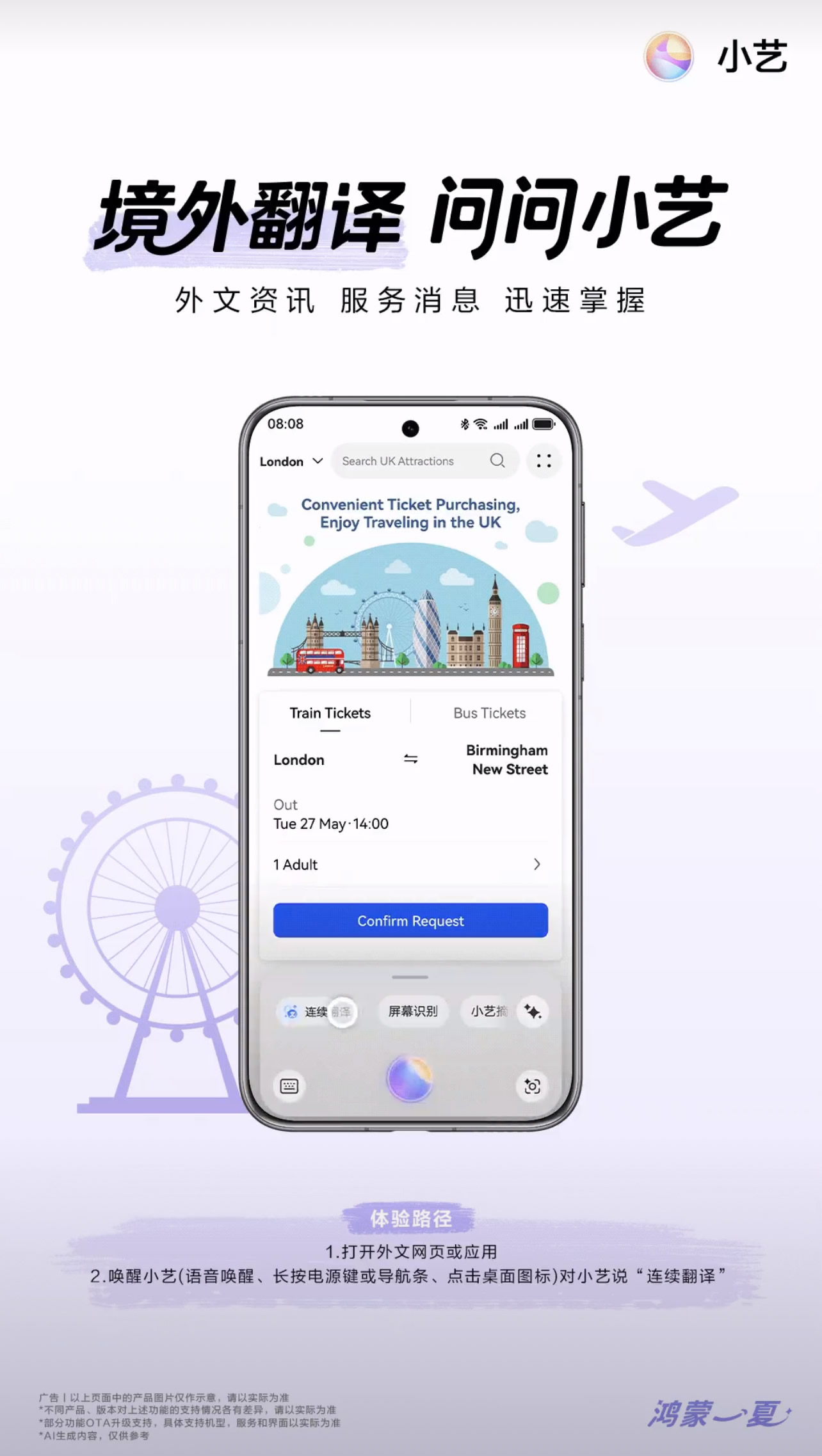 境外游時,難免遇到瀏覽當地網站訂票、打車時卻發(fā)現根本看不懂的麻煩。升級到鴻蒙 5.1的用戶這時就可以用小藝“連續(xù)翻譯”功能解決。長按小藝導航條,點擊“連續(xù)翻譯”服務即可體驗,一次開啟就能實現屏內邊瀏覽邊翻譯的系統級連續(xù)翻譯體驗,支持截屏、文檔、瀏覽器等全場景的連續(xù)性翻譯。
