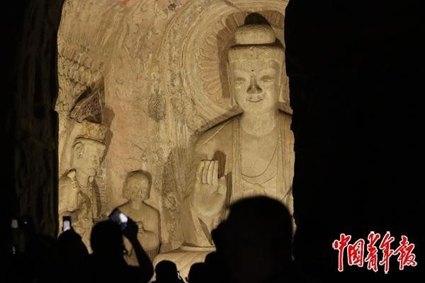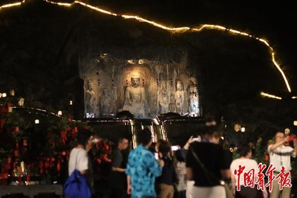 8月19日,河南洛陽,游客在夜色中參觀龍門石窟的賓陽洞。中青報·中青網記者 余冰玥/攝